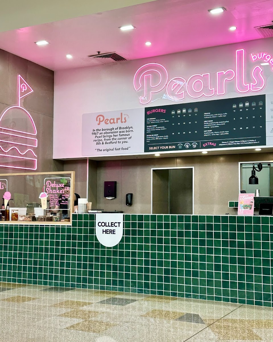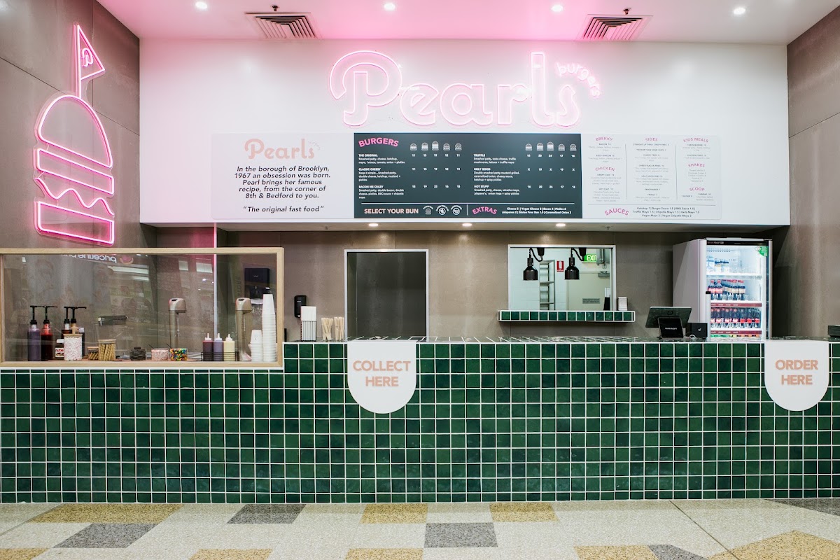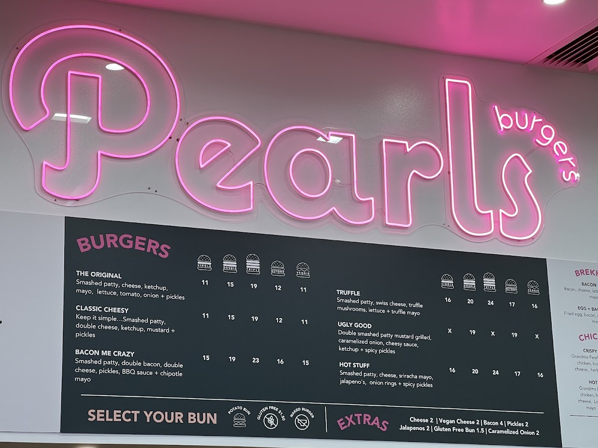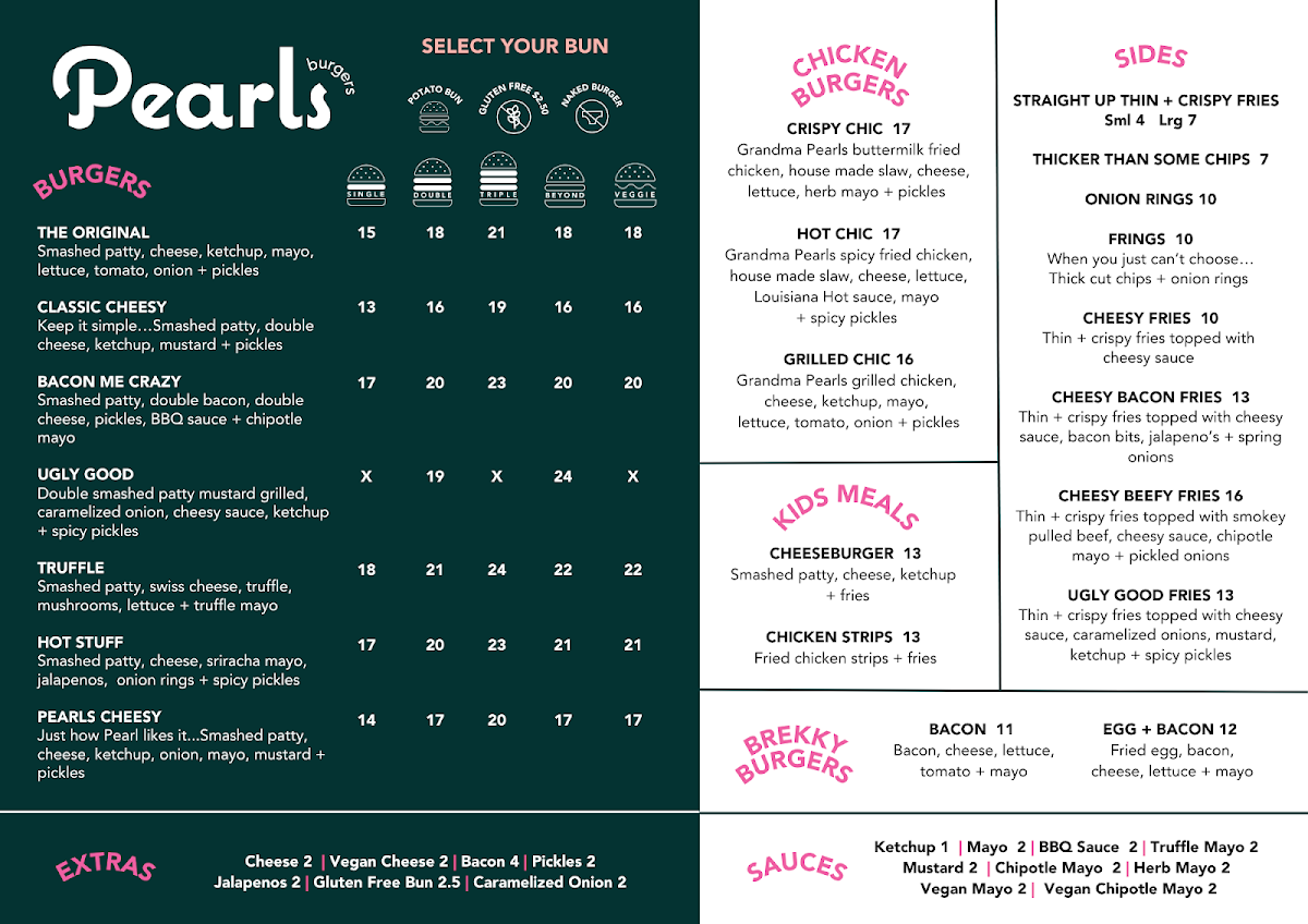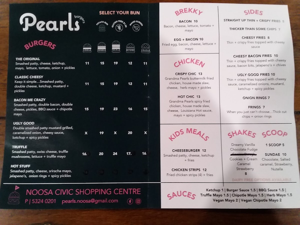 The menu at Pearls Burgers Noosa Civic focuses on a variety of hamburgers and chicken options, accompanied by several side choices and a selection of sauces. It is designed to cater to casual meals, suitable for lunch or quick dining during shopping visits.
